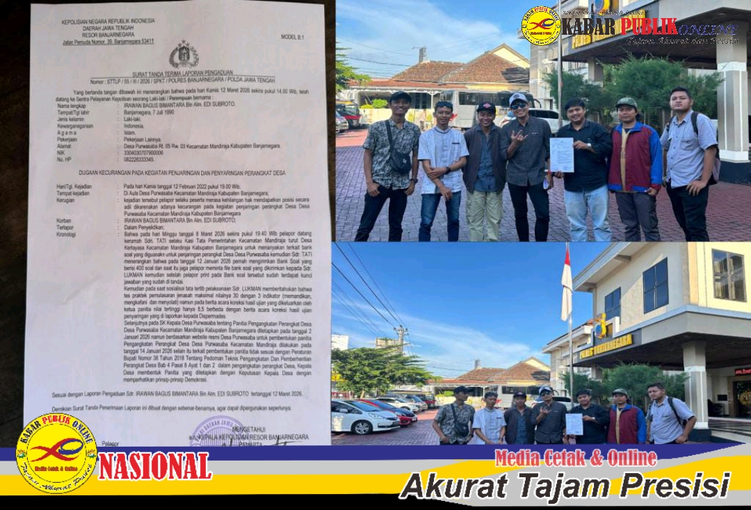 Proses penjaringan dan penyaringan perangkat desa di Desa Purwasaba, Kecamatan Mandiraja, Kabupaten Banjarnegara, Jawa Tengah, kini tengah menjadi sorotan. Seorang warga bernama Irawan Bagus Bimantara dan 9 orang lainya resmi melayangkan laporan pengaduan ke Polres Banjarnegara pada Kamis (12/3/2026).terkait dugaan adanya manipulasi dan ketidakproseduralan dalam proses seleksi tersebut.